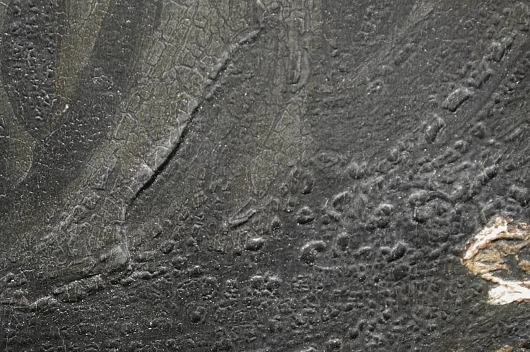 A close-up of the bitumen scales seen on an affected painting, Image from Fine Art Restoration.