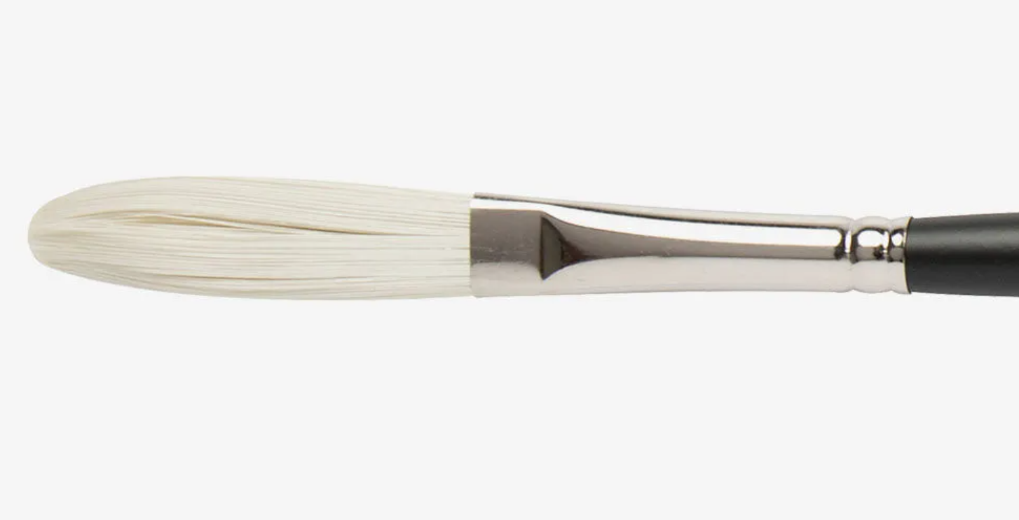Natural hog hair brushes are a popular choice for oil painting because of their durability and paint-holding ability. Each hog bristle has "flags," which are small split ends that increase the brush’s capacity to hold paint, allowing for smoother, more even application. High-quality hog brushes feature dense, stiff hair with many flags, ensuring that they hold their shape well and last longer. When selecting hog bristles, check for natural, unbleached shades. Bleaching weakens the bristle, making it more prone to breakage.