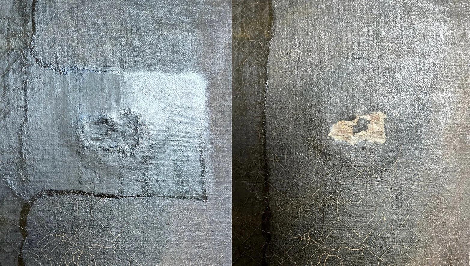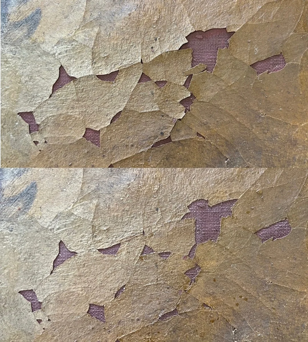 One of the key treatments I participated in involved a structurally compromised 17th-century French oil painting on canvas. The painting exhibited extensive cupping and flaking, with insecure paint along areas of previous mechanical deformation. My initial task focused on consolidation of the lifting paint layer, using an adhesive with a heat spatula through silicon release paper to return the flakes to plane.