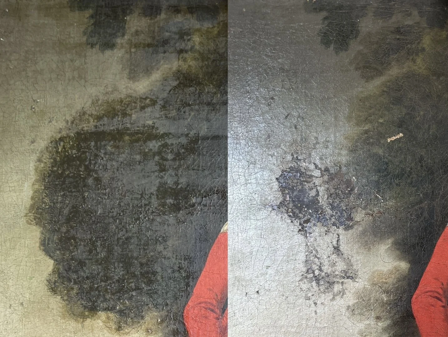 A second major treatment involved a 18th-century portrait of a British military figure. The painting had a thick, streaky, and discoloured natural resin varnish, evidence of past lining and previous interventions, and numerous areas of structural and aesthetic instability. My involvement began with surface cleaning, carried out using dry methods on the reverse and tested aqueous solutions on the front. This was followed by removal of the varnish layer, performed using UV light alongside various solvents to ensure minimal disruption to the original paint film.