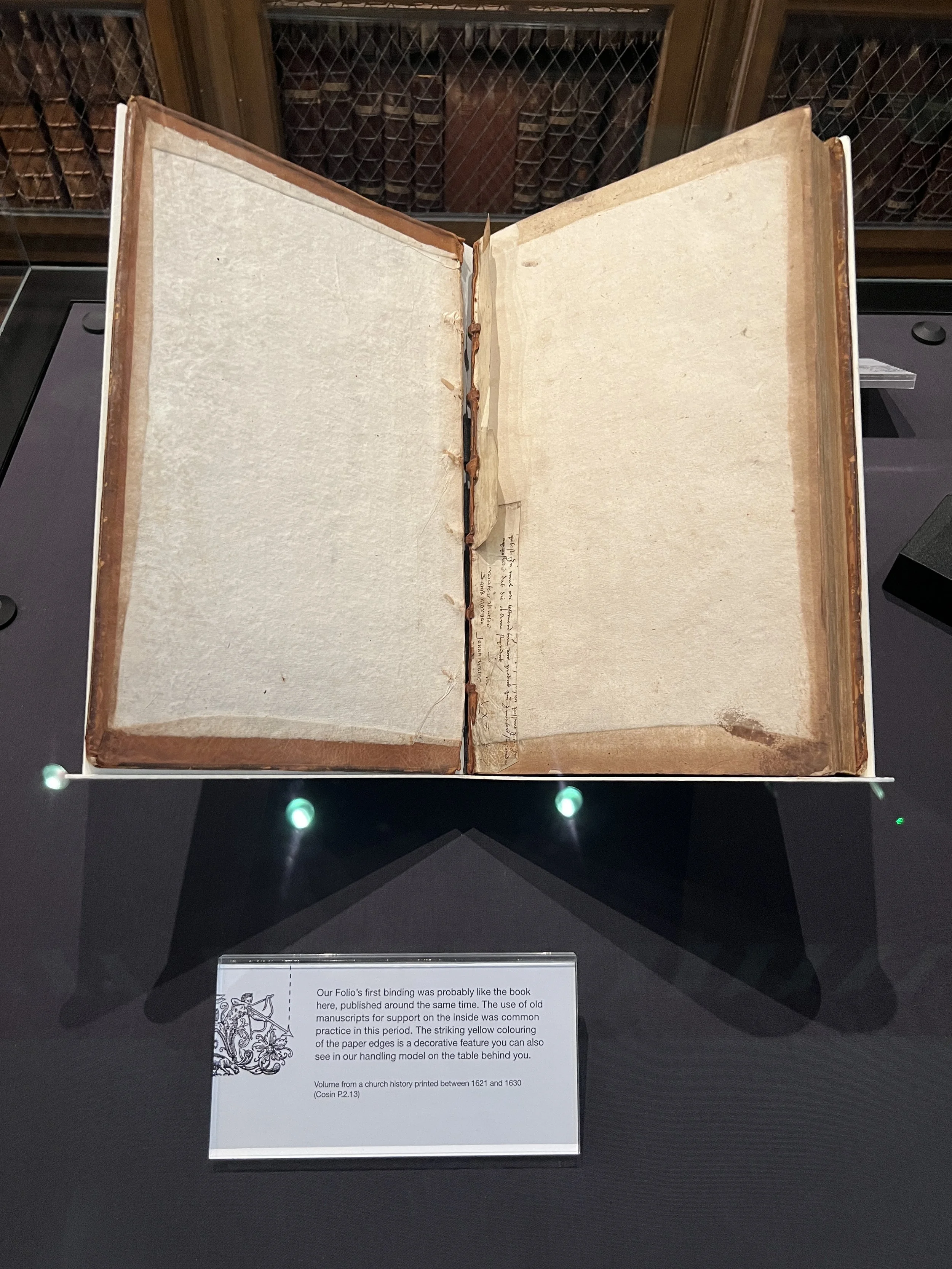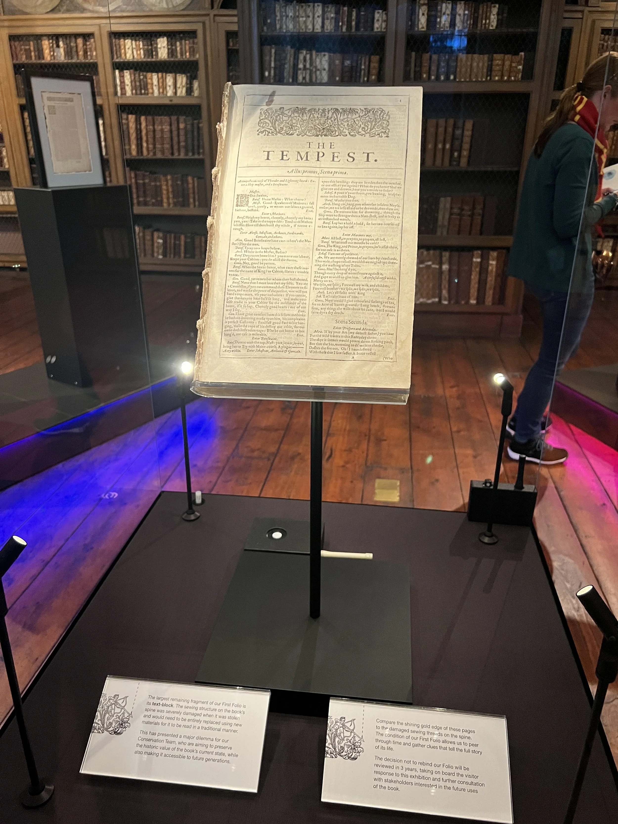 The Folio’s damaged condition paradoxically allows scholars to see aspects of early bookmaking that are usually concealed. The removal of the cover has left the spine exposed, revealing evidence of its seventeenth-century binding. For visitors, this provides an opportunity to observe the methods of book production in Shakespeare’s time, insights that more intact copies cannot easily provide.