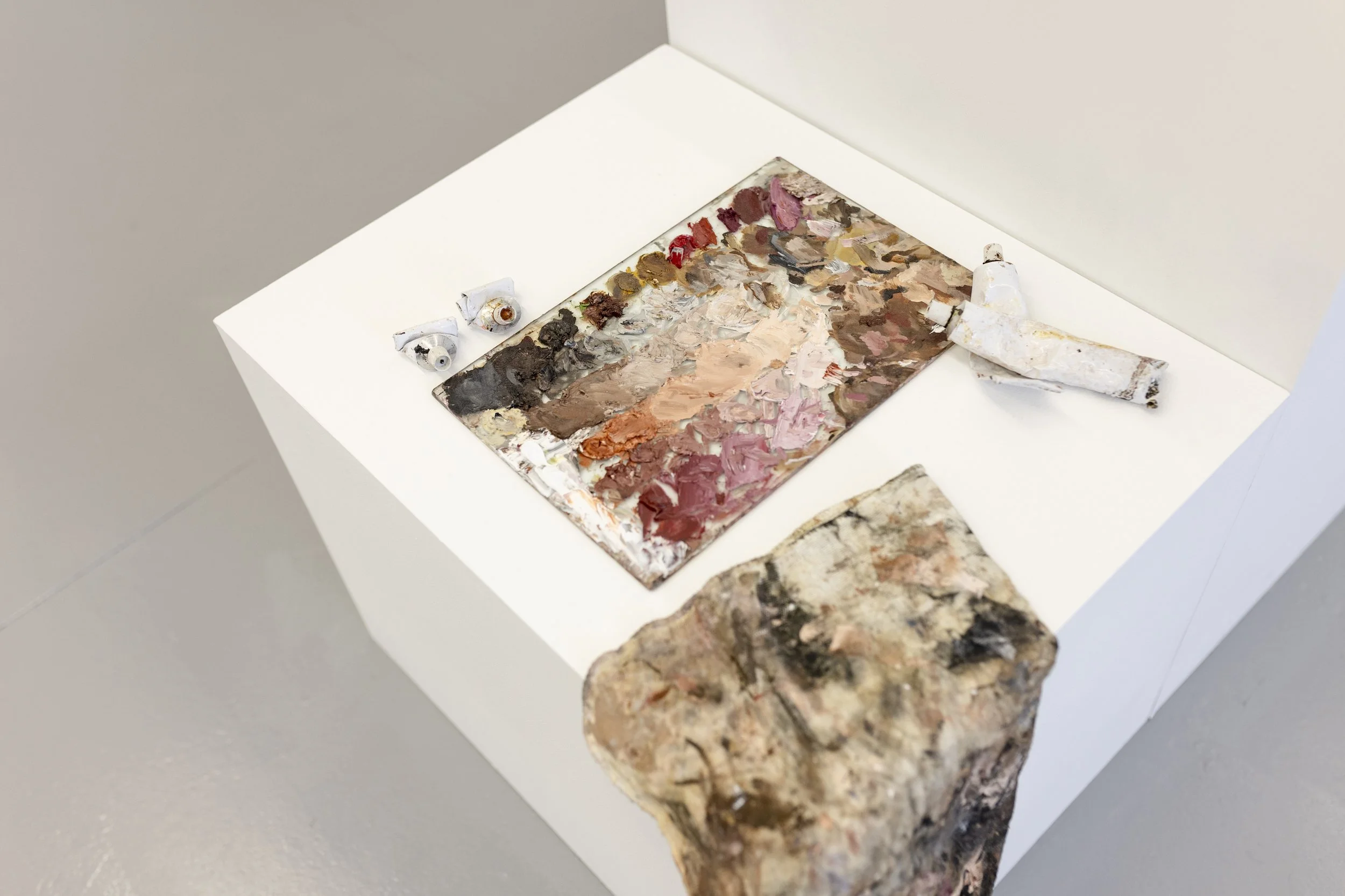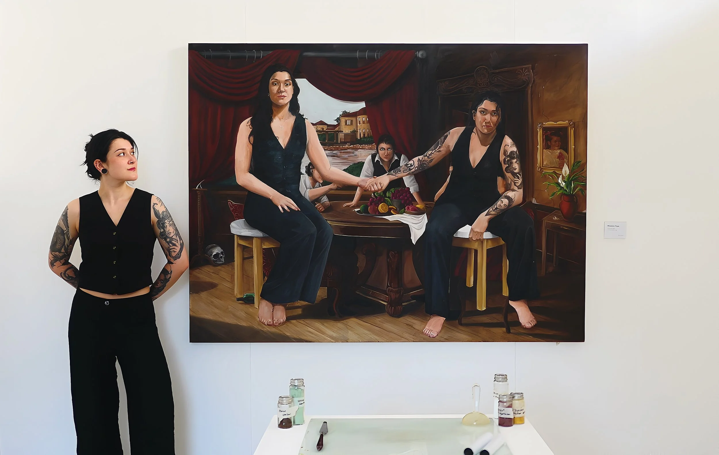 Among the featured works are two pieces by myself: "The Artist" and "The Studio." "The Artist" is an oil painting that delves into self-portraiture and the complexities of self-representation and identity. This work confronts the inherent biases and preconceptions an artist brings to the depiction of the self, and further reflects on the my preference to rely solely on myself as both subject and creator. Complementing this piece, "The Studio" offers audiences a glimpse into the artist's creative space, showcasing tools like a muller and glass slab used for making handcrafted paints. Together, these works provide insight into both the final product and the meticulous process behind it.